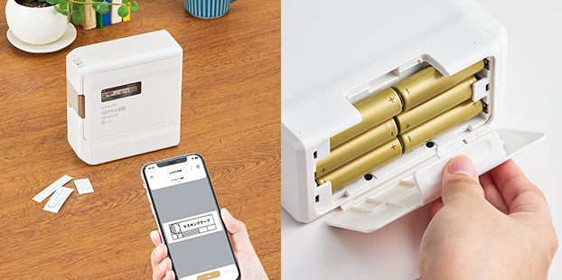 本体は、単3形アルカリ乾電池×6本(別売)または単3 形充電式ニッケル水素電池×6本(別売)で駆動するため、場所を選ばずにどこでもラベルを作ることができます。