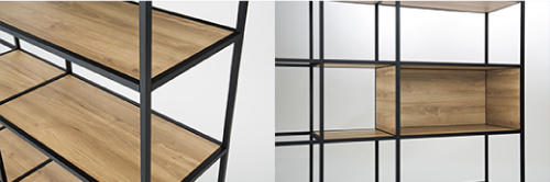 フレームはホワイトグレーとブラックの2種類、棚はスチールと木目の2つのタイプから選べます。