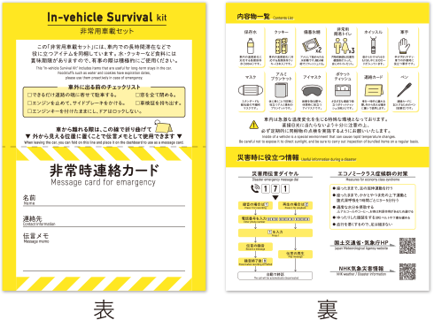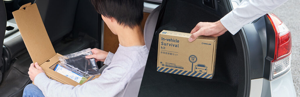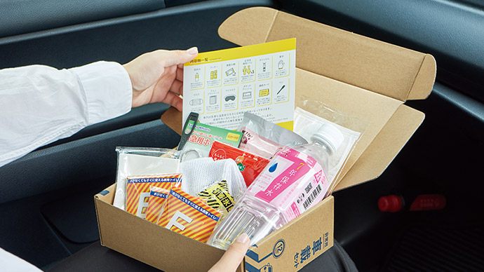 車で待機しなければならない状況で安心できるように、車に備蓄する災害対策セットです。